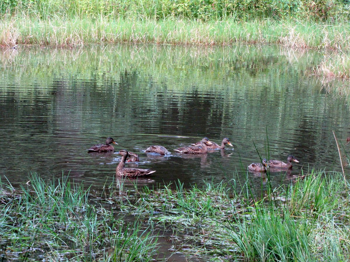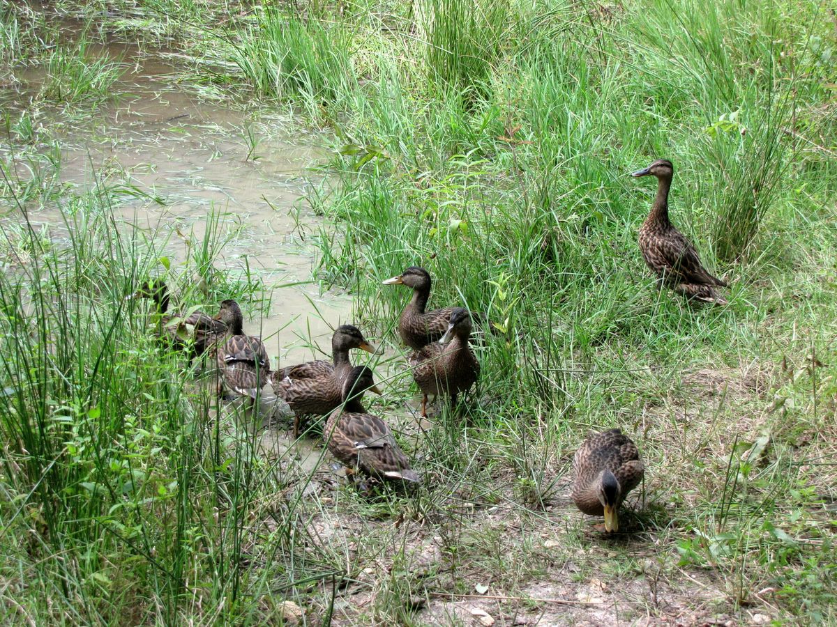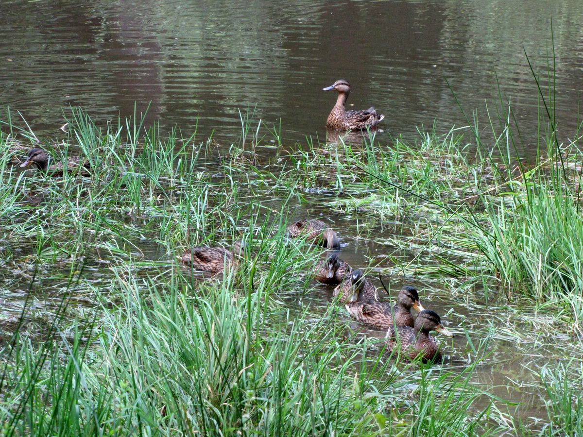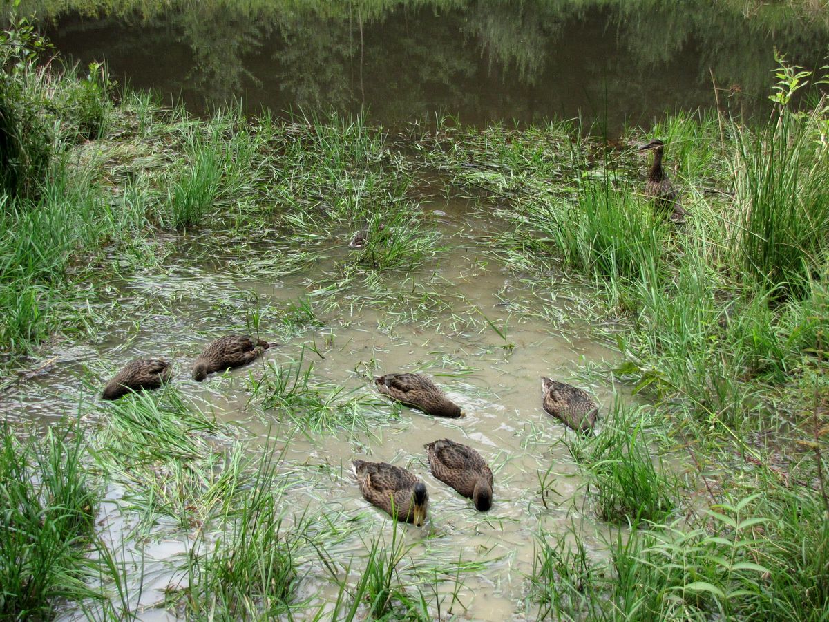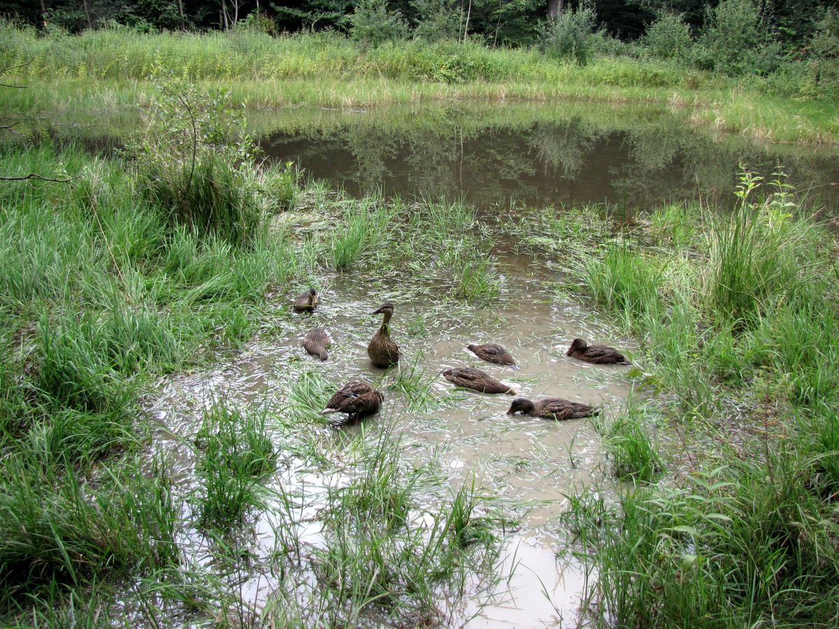 La cane veille sur les canetons âgés d'environ 4 semaines.