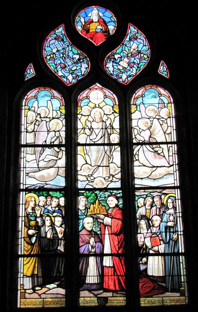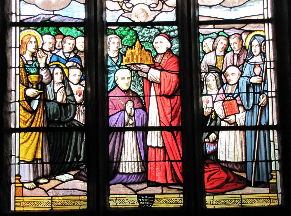 D'azur à l'ancre de marine encordée d'or, surmontée d'une mitre du même décorée d'un galon de sable bordé d'or en pairle renversé, dont les fanons aussi de sable bordés et doublés aussi d'or délimitent un chef émanché de sinople, ladite mitre accostée de deux mouchetures d'hermine d'or.