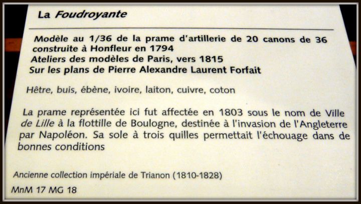 Malgré son nom, ce modèle ne correspond pas à La Foudroyante construite en 1794 à Honfleur. Il comporte l’armement des prames des années 1760, soit vingt canons de 36. Il s’agit probablement d’un modèle plus ancien, restauré pour rejoindre Trianon. Il n’y fut cependant jamais envoyé, n’étant pas achevé.