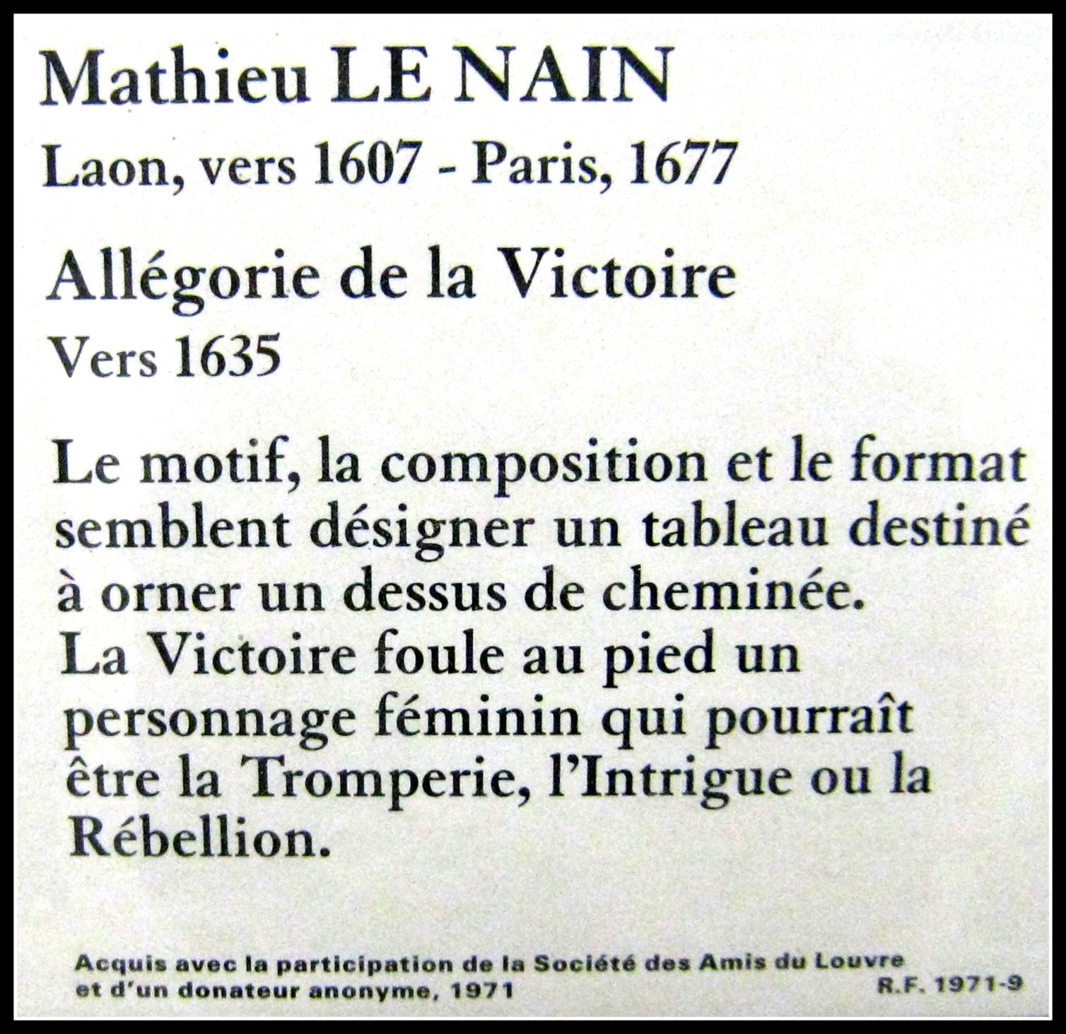 Cette étrange peinture, unique et inattendue dans la production des frères Le Nain, fut découverte au château de Cheneviery, près de Montargis, et acquise, en 1971, par le Louvre avec la participation de la Société des Amis du Louvre.