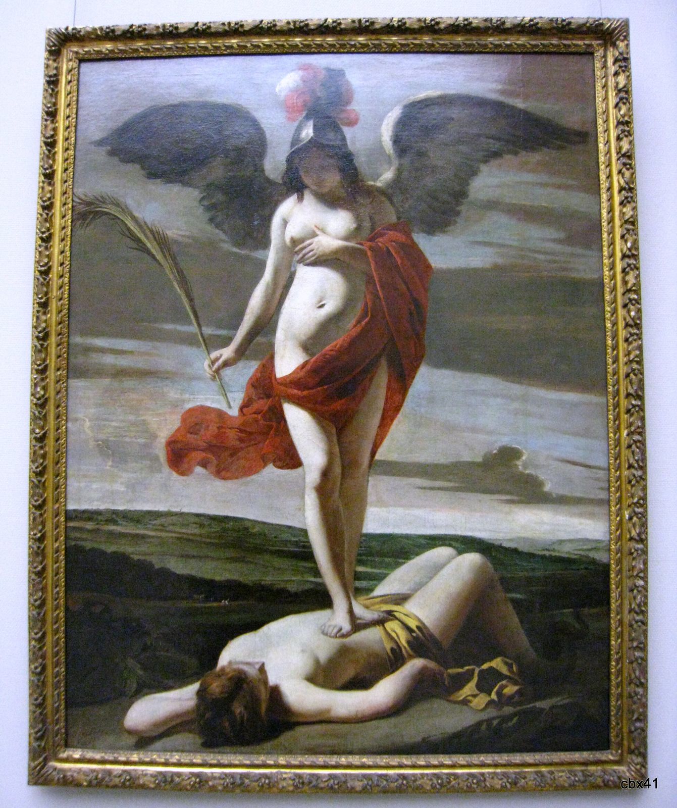Une femme nue, casquée, aux ailes déployées, dont la pudeur est préservée par un drapé rouge, se tient debout, victorieuse, sur une créature au corps plutôt féminin et dont les jambes se terminent en queue de serpent. La jeune femme au corps charnu et sensuel contemple son étrange captif en brandissant une palme et en portant sa main à la poitrine. Elle symbolise la Victoire, mais contre qui ? L'allégorie à ses pieds a été interprétée comme la Tromperie, l'Intrigue ou la Rébellion, vices dans l'air du temps et combattus par les esprits distingués. La composition est animée par un jeu savant de lignes obliques dans le ciel qui rompent la géométrie un peu stricte de la scène. Le nu, triomphant, s'impose au spectateur devant un paysage animé sur la droite par quelques minuscules figures.